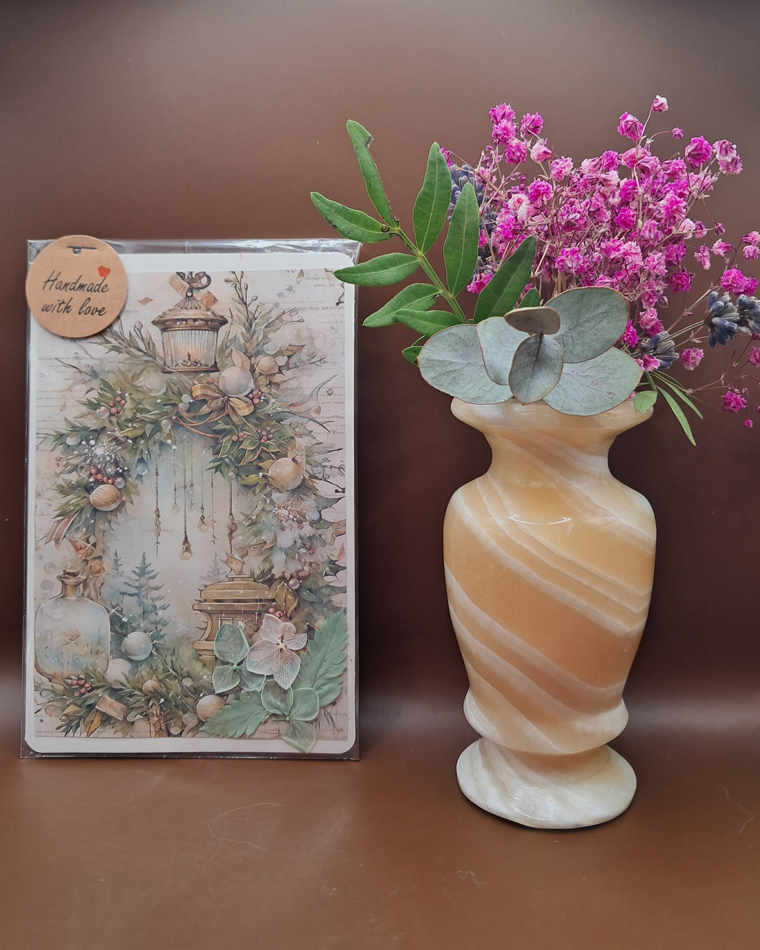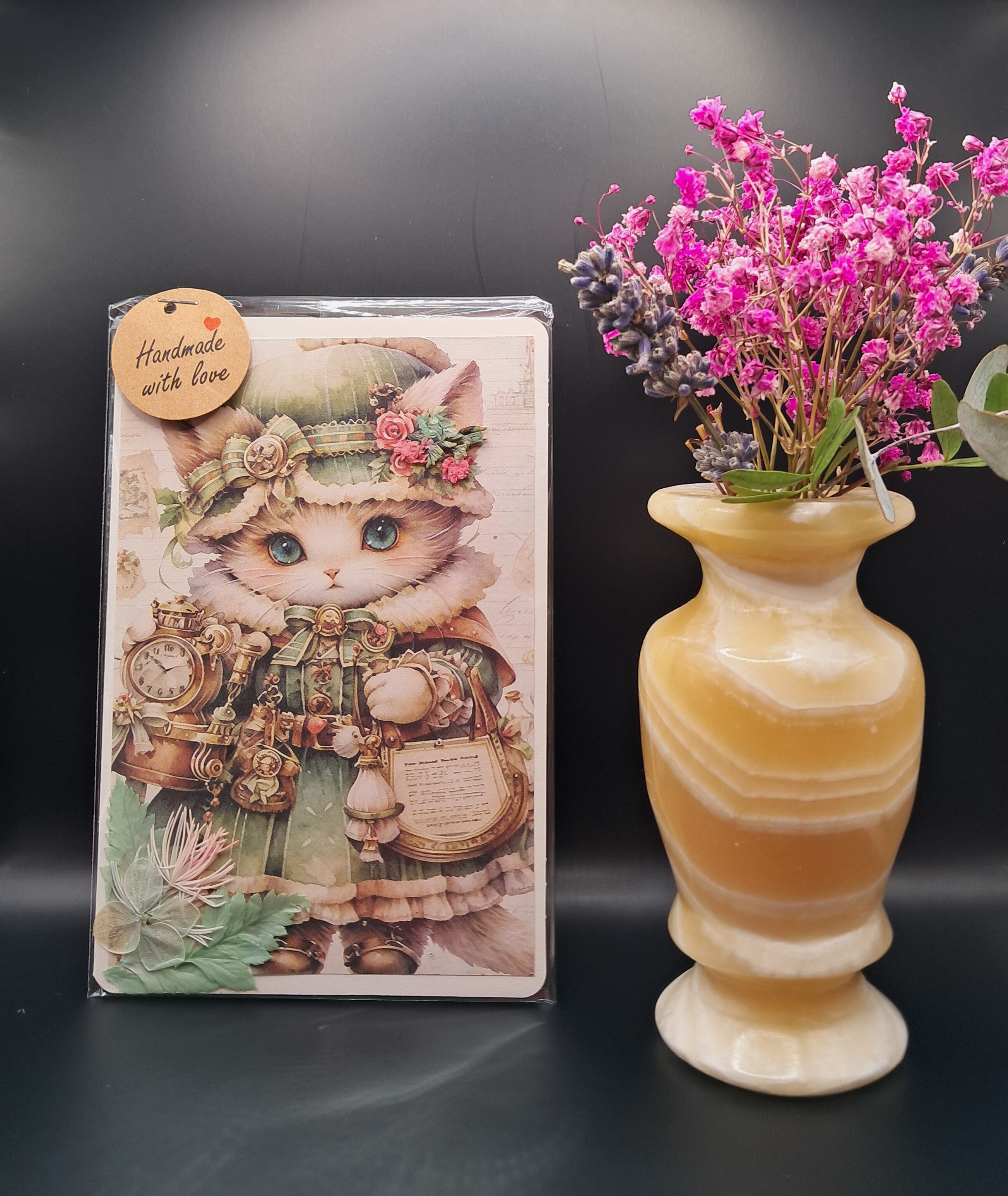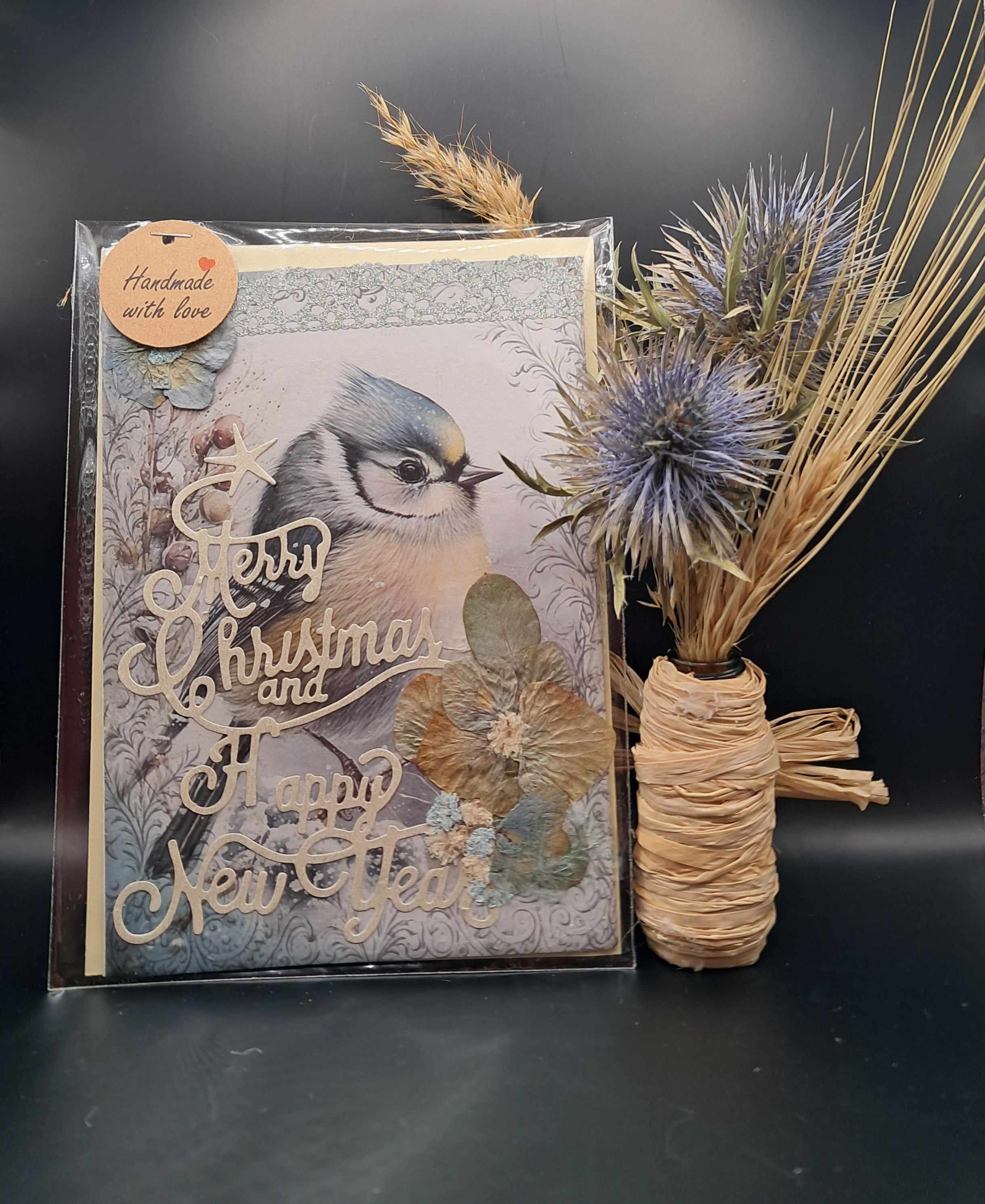 Une carte, une véritable œuvre unique signée SmArtis ! Ce modèle entièrement fabriqué à la main représente un petit Chat de Noël aux couleurs douces et raffinées. Cette carte est ornée de fleurs naturelles séchées, ajoutant une touche poétique et authentique à votre message. Le charme de l’artisanat pour des vœux inoubliables, livrée avec son enveloppe prête à l’envoi.